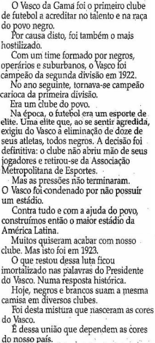 A publicação tinha o título "13 de maio Cem Anos de Abolição. Homenagem do Clube de Regatas Vasco da Gama. Um clube tão preto e branco quanto o Brasil.", prosseguia com um texto (em detalhe, mais abaixo) e era finalizada com uma reprodução da conhecida Reposta Histórica.