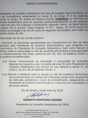 O presidente do Conselho Deliberativo do Vasco, Roberto Monteiro, que também é líder do grupo Identidade Vasco (o mesmo a que pertence os 13 vice-presidentes que renunciaram aos seus cargos), convocou uma reunião extraordinária para o dia 14 de maio, às 20h (de Brasília), na Sede Náutica da Lagoa.