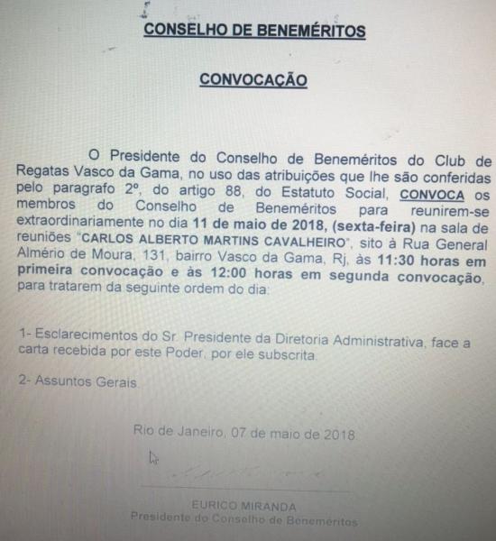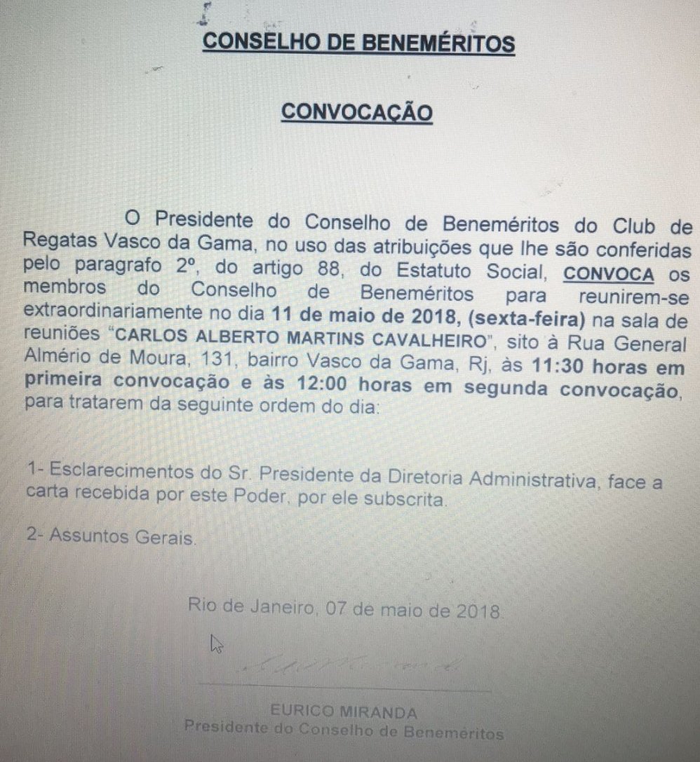 Vale lembrar: próximos 2 dias úteis são decisivos para a política do Vasco. Na 2a às 20h o Deliberativo se reúne para decidir se abre ou não inquérito contra o presidente Alexandre Campello. Mas já amanhã, às 11h30, o mandatário prestará esclarecimentos aos Beneméritos #lanceVAS