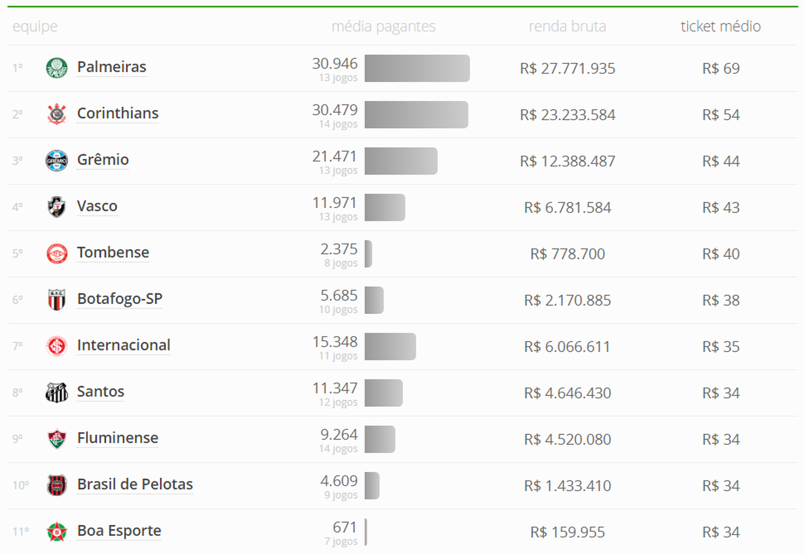O rival Corinthians está em segundo na lista dos clubes com tickets médios mais "salgados" na atual temporada. Para ver um jogo do Timão em casa é preciso desembolsar R$ 54 em média por ingresso. Completam as cinco primeiras posições: Grêmio (R$ 44), Vasco (R$ 43) e Tombense (R$ 40), uma das surpresas no ranking, assim como Botafogo-SP (sexto, com preço médio de R$ 38), Brasil de Pelotas e Boa Esporte (ambos em oitavo, com ticket médio de R$ 34).
