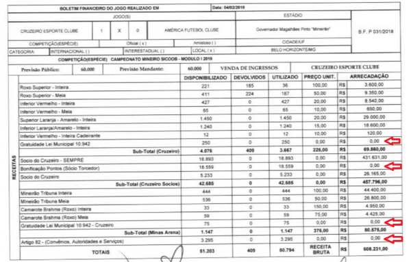 Para chegarmos ao número de pagantes a conta é simples: somamos a quantidade de ingressos utilizados disponíveis no boletim financeiro do jogo que geraram renda ou substraímos o público total pelos ingressos utilizados que estão zerados na arrecadação, como mostramos com as setas na imagem abaixo do borderô de Cruzeiro 1 x 0 América-MG.
