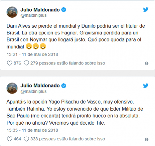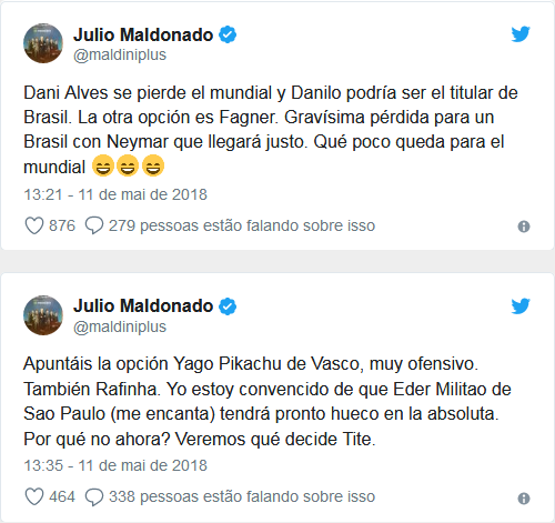 Pelo Twitter, Julio Maldonado, que tem mais de 823 mil seguidores na rede social, afirmou que Danilo, do Manchester City, deve ser o titular da Amarelinha. Como reserva, lembrou de Fagner, do Corinthians, Rafinha, do Bayern, e comentou também sobre o lateral do Vasco. Para ele, Pikachu seria uma alternativa ofensiva caso Tite buscasse um atleta nessas características. Veja abaixo o post: