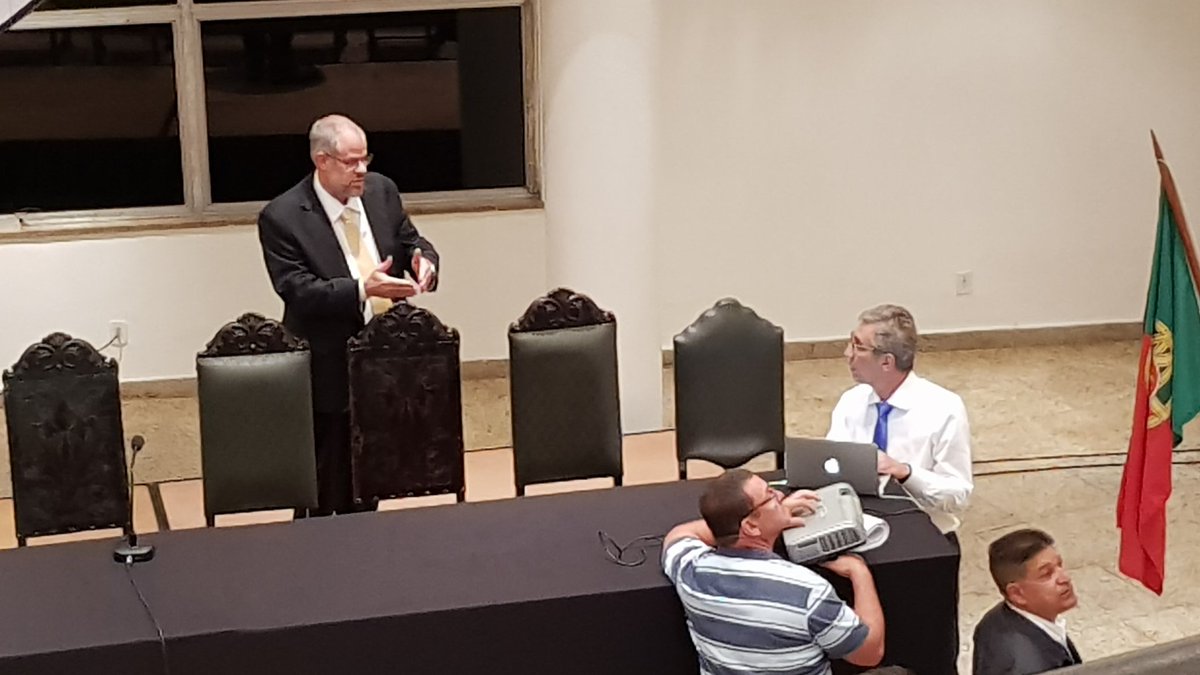 Monteiro avisa a Alexandre Campello, testando um projetor, que o que não tiver na ordem do dia do Deliberativo não será considerado #lanceVAS
