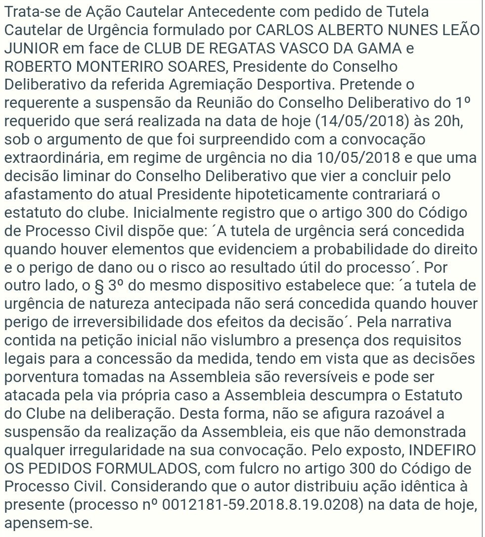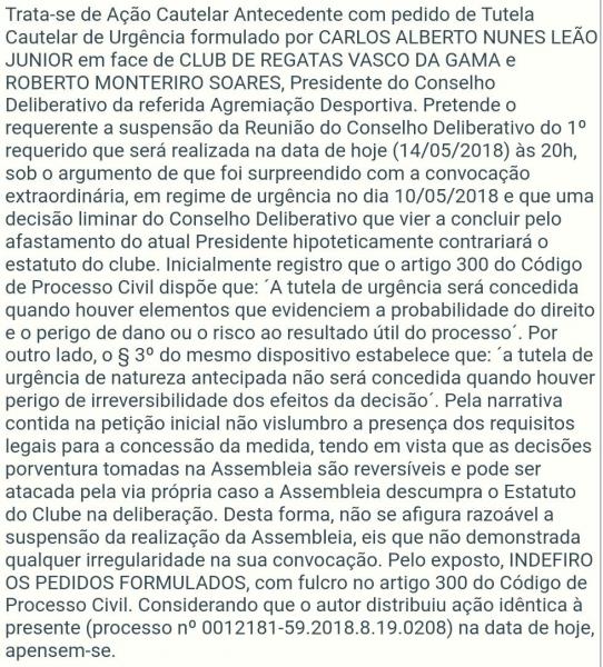 Juíza Ana Estrella, da Vara do Plantão do TJRJ, acaba de negar mais uma liminar para cancelar a reunião do Code do Vasco. Espia #lanceVAS