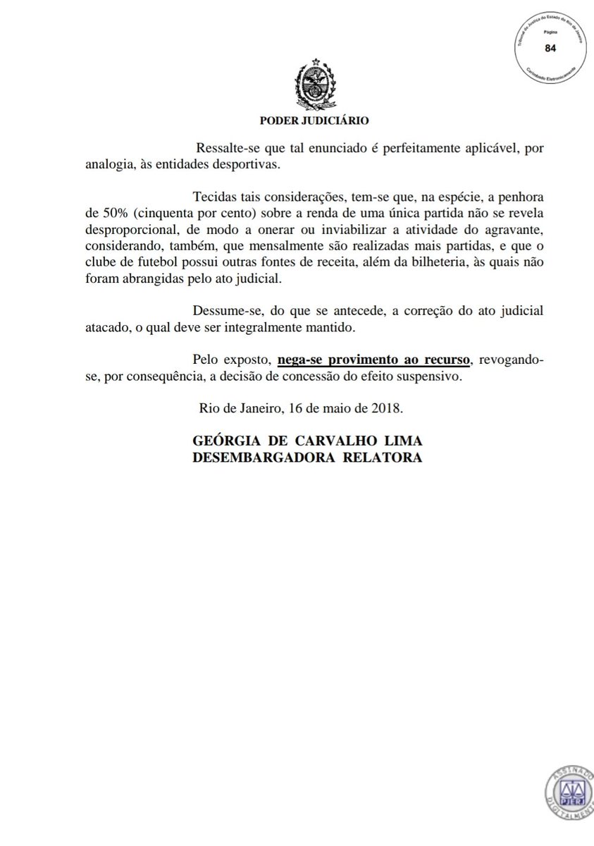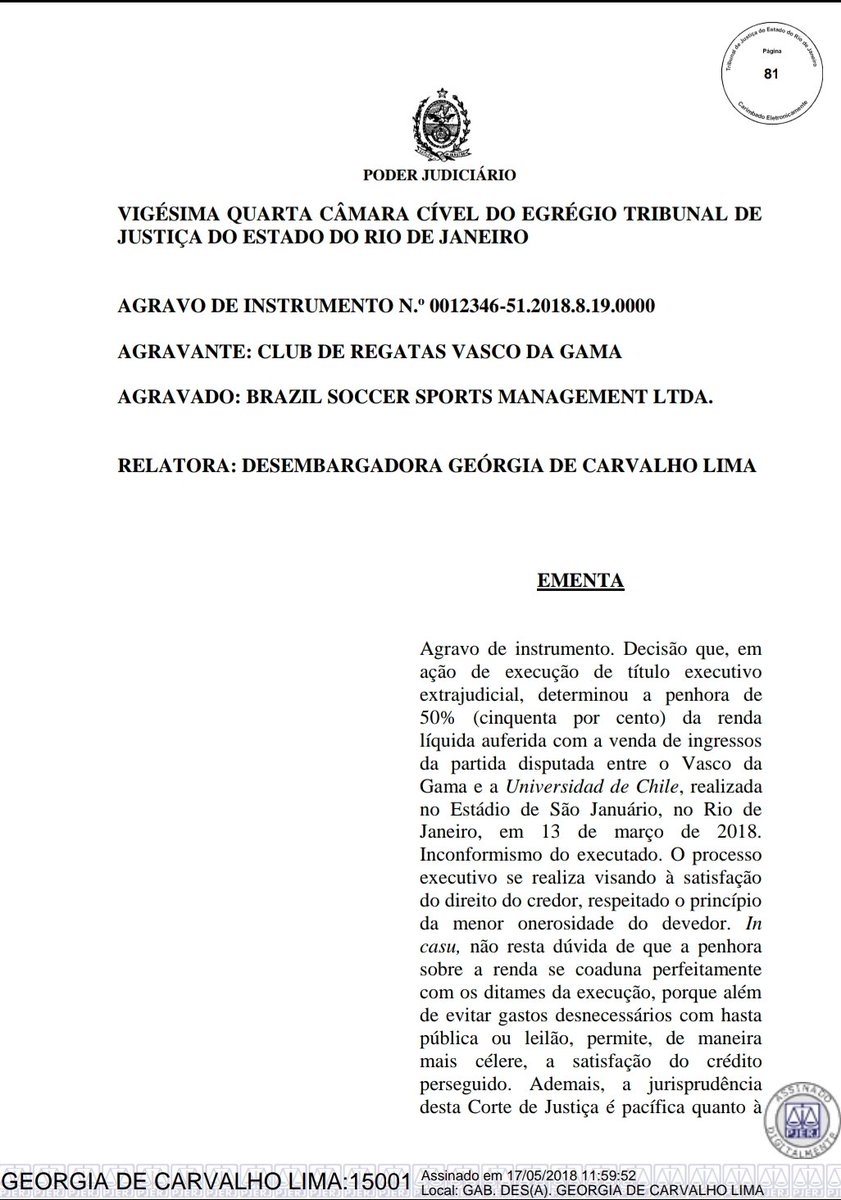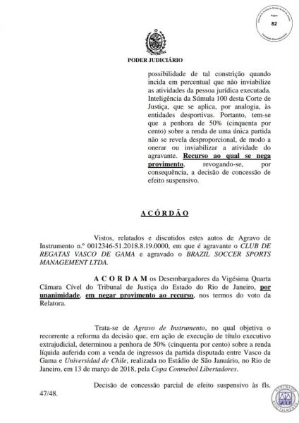 Por unanimidade, a 24a Câmara Cível do Tribunal de Justiça do Rio negou recurso do Vasco contra a penhora de 50% da renda líquida do jogo contra a Universidad de Chile, em São Januário, pela Libertadores (cerca R$ 500 mil). A relatoria foi da desembargadora Geórgia Lima #lanceVAS