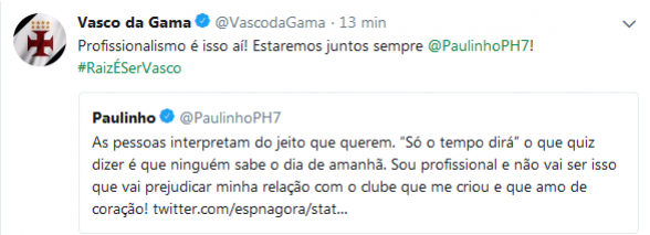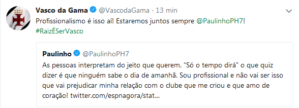 Profissionalismo é isso aí! Estaremos juntos sempre @PaulinhoPH7! #RaizÉSerVasco https://t.co/T1BMyq1F42— Vasco da Gama (@VascodaGama) 17 de maio de 2018