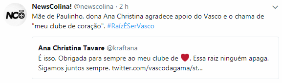 Mãe de Paulinho agradece apoio do Vasco e o exalta: 'Meu clube de coração'