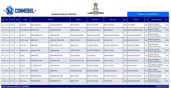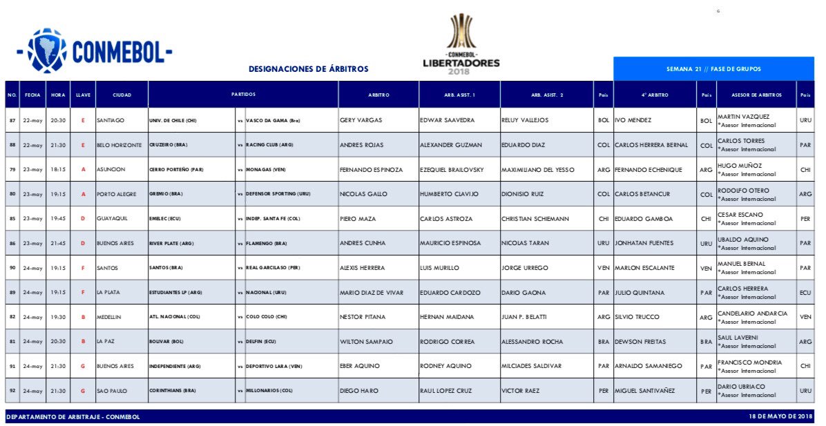 Árbitros para la semana 21 Fase de Grupos de la #CONMEBOLLibertadores