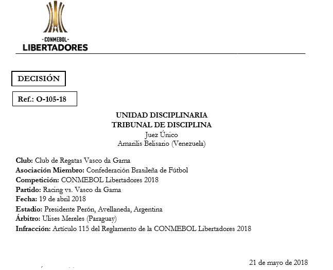Conmebol adverte o Vasco por não ter levado jogador à coletiva após goleada para o Racing