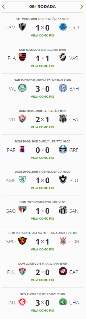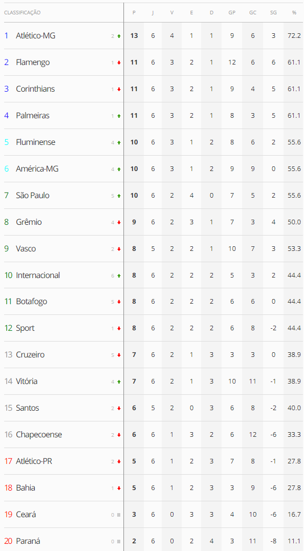 Terminada a 6ª rodada do Brasileiro, o Vasco, que empatou com o Flamengo por 1 a 1, caiu da 7ª para a 9ª colocação na classificação. O Gigante da Colina, no entanto, tem 1 jogo a menos do que a maioria dos participantes, pois seu duelo contra o Santos, fora de casa, válido pela 3ª rodada, só será realizado após a Copa do Mundo.