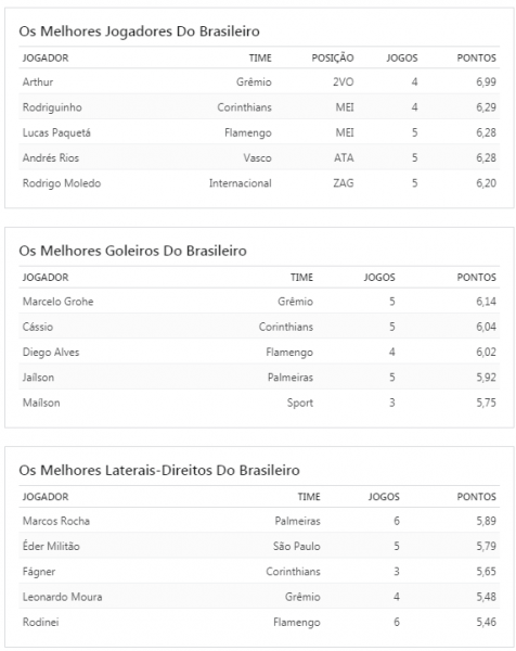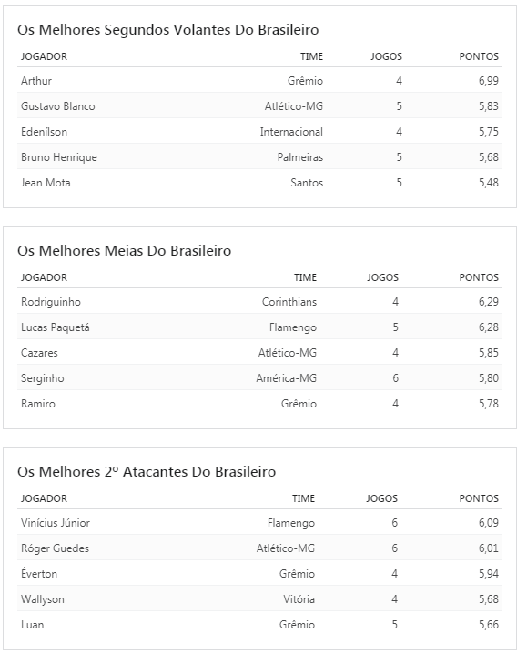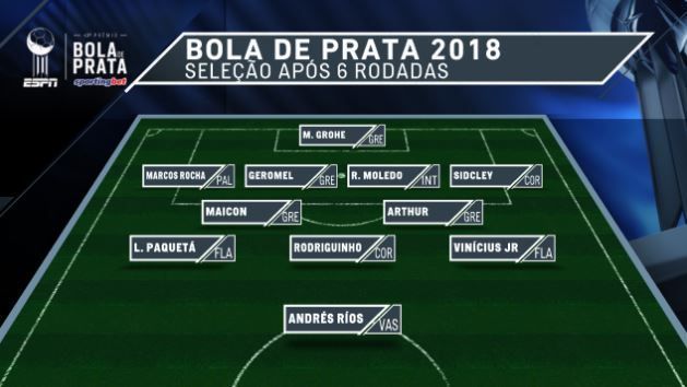 Assim, após essa 6ª rodada, a seleção do 49º prêmio ficou ESPN Bola de Prata Sportingbet assim: Marcelo Grohe (Grêmio), Marcos Rocha (Palmeiras), Rodrigo Moledo (Internacional), Geromel (Grêmio) e Sidcley (Corinthians); Maicon (Grêmio), Arthur (Grêmio), Rodriguinho (Corinthians) e Lucas Paquetá (Flamengo); Vinícius Júnior (Flamengo) e André Ríos (Vasco).