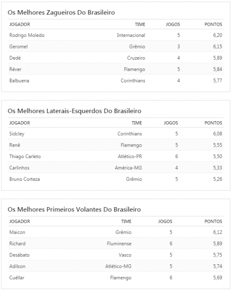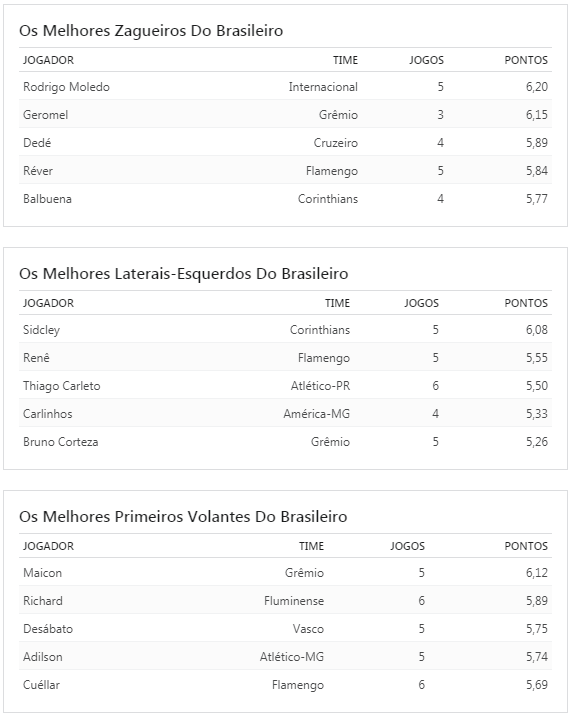 Na zaga, Rodrigo Moledo, que marcou o segundo gol do Inter na vitória contra a Chapecoense, voltou à seleção do Bola de Prata, desbancando Réver, do Flamengo, e formando a dupla de zaga do prêmio ao lado de Geromel.