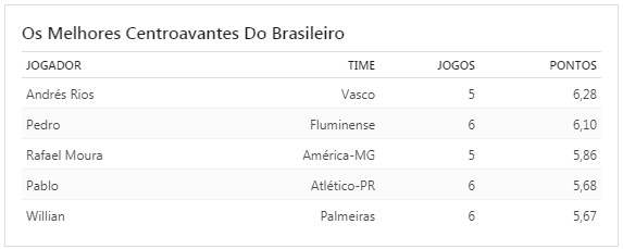 Já no comando do ataque da seleção do Bola de Prata, o argentino Andrés Ríos, do Vasco, que participou do gol de Wagner no clássico contra o Flamengo, tomou a liderança de Pedro, do Fluminense, entre os centroavantes.
