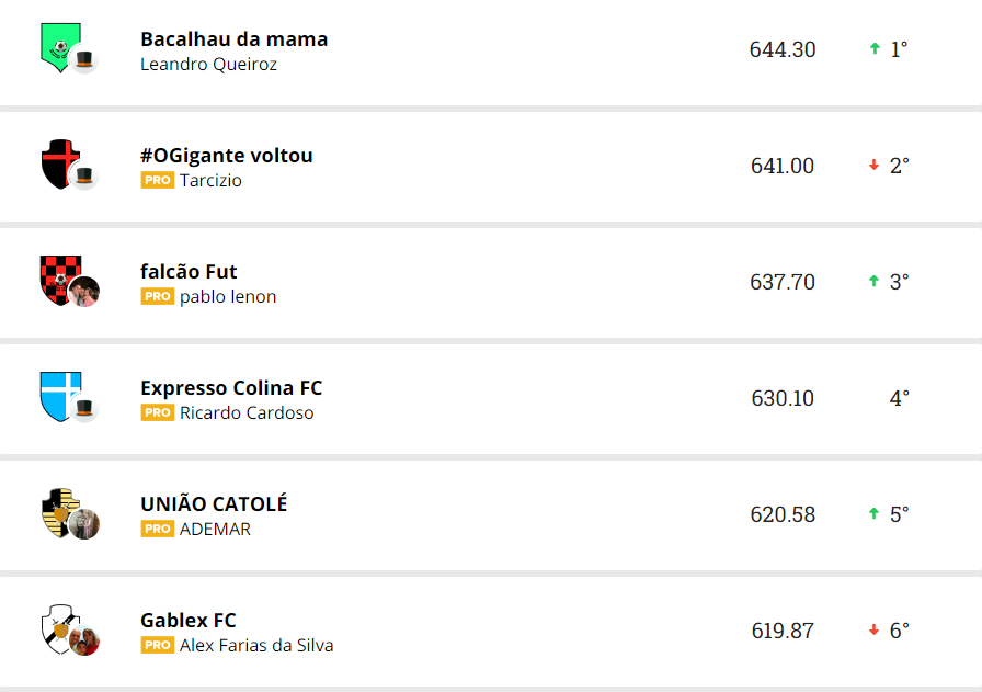 Cartola FC: Confira a classificação da Liga NETVASCO após a 6ª rodada