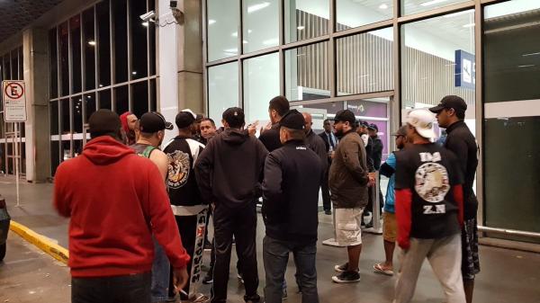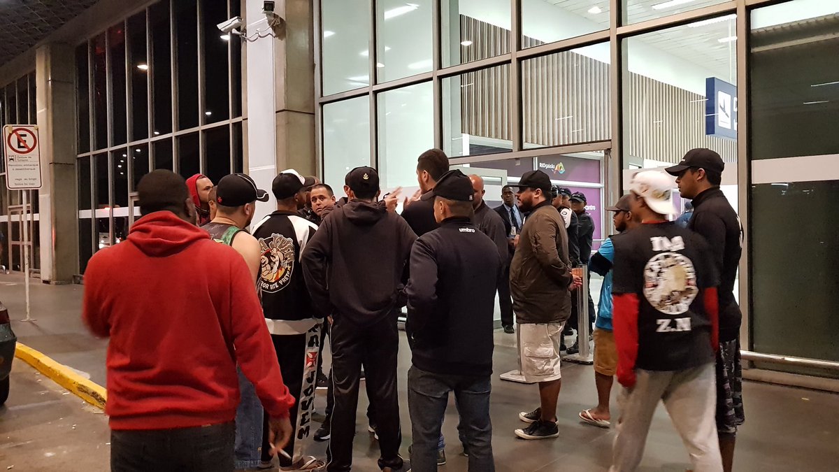 Segurança do Vasco conversa com os torcedores presentes aqui no Galeão. Saída do quarteto ainda não aconteceu #lanceVAS