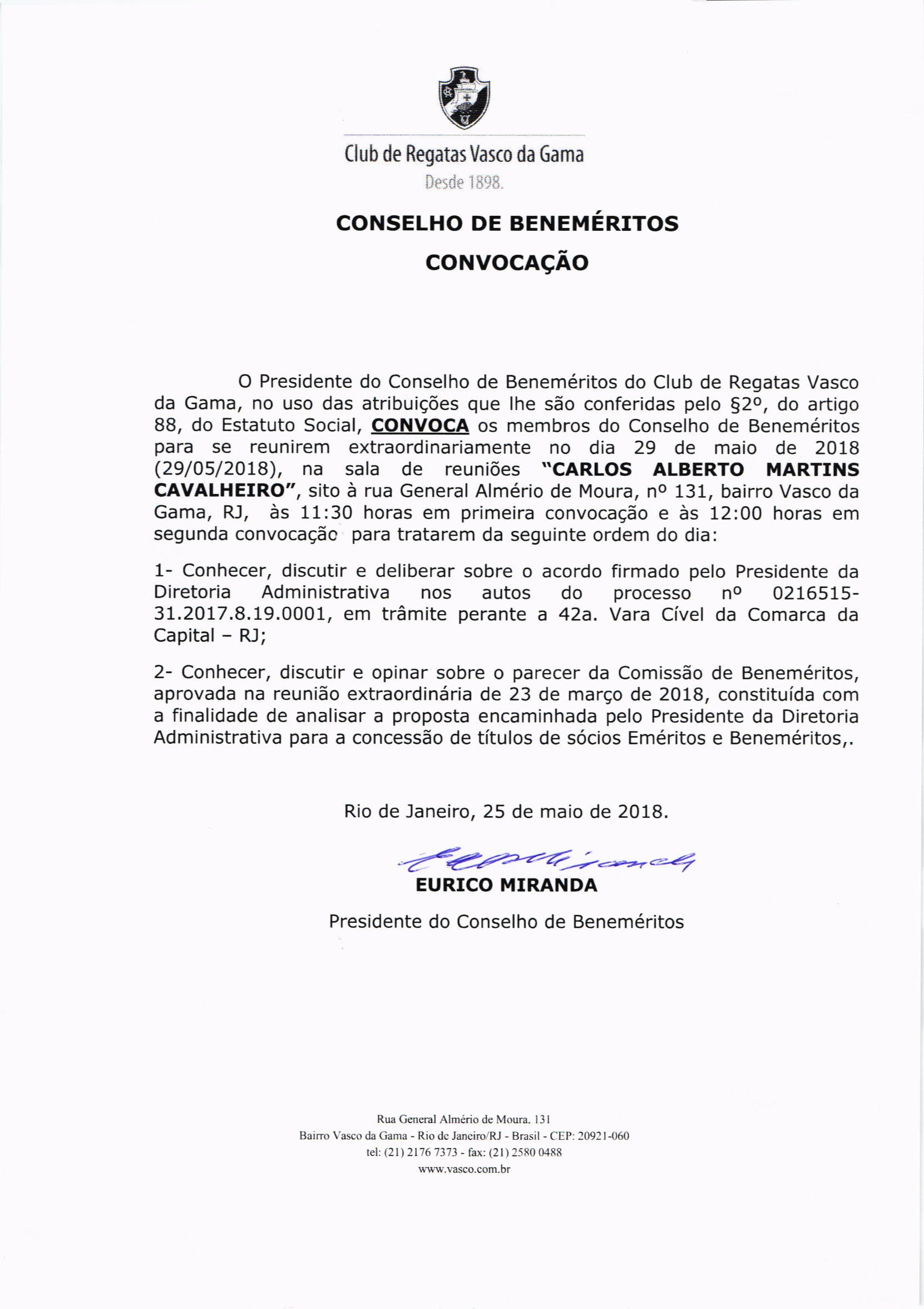 07/05/18 - Eurico Miranda convoca reunião do Conselho de Beneméritos pra ouvir esclarecimentos de Alexandre Campello
