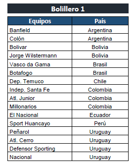 Bolillero 1: Los 10 equipos procedentes de la CONMEBOL Libertadores, más los 6 equipos de mejor performance de la PRIMERA FASE de la CONMEBOL Sudamericana.