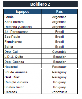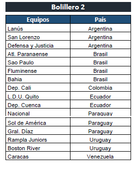 Bolillero 2: Los 16 equipos restantes clasificados de la PRIMERA FASE de la CONMEBOL Sudamericana.