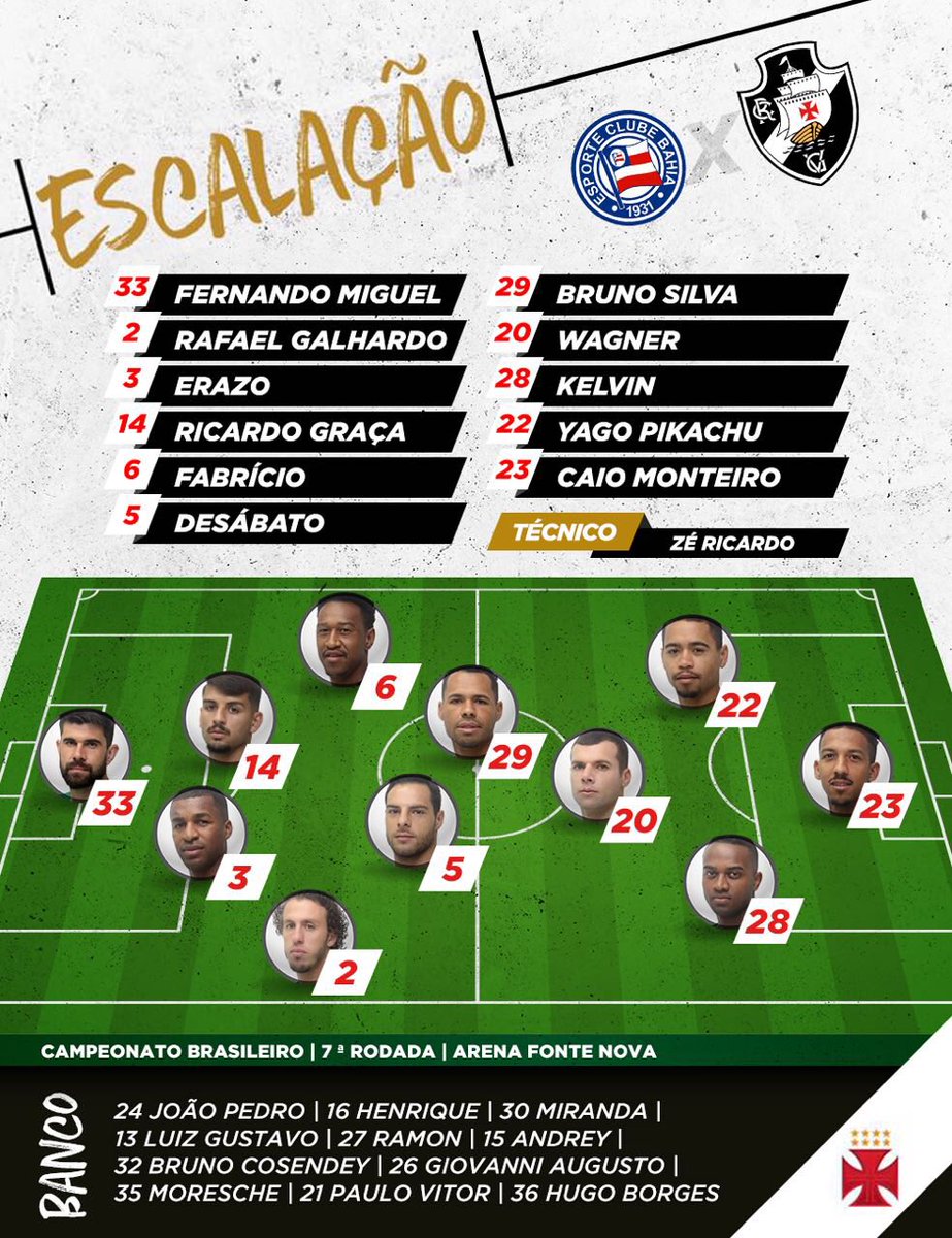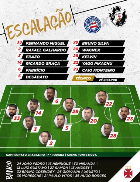 Confira a escalação do Vasco; Ricardo Graça e Kelvin são as novidades no time titular