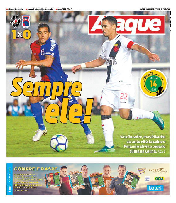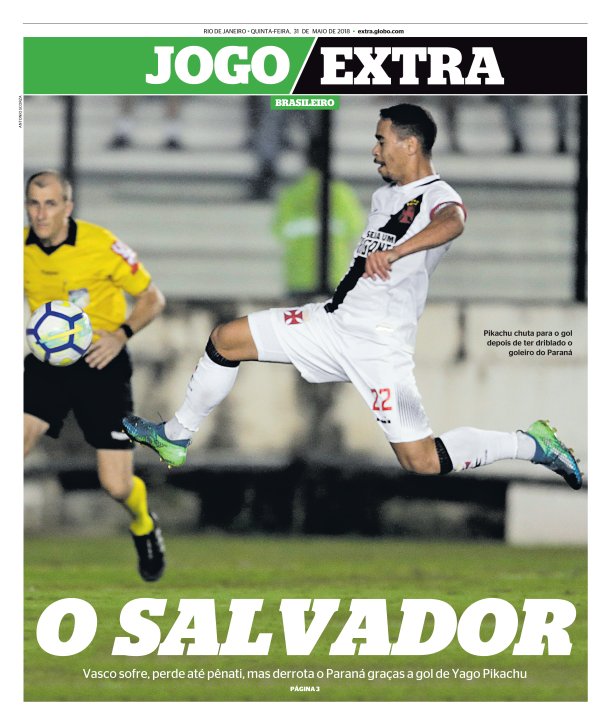 O Vasco derrotou o Paraná por 1 a 0 na última 4ª-feira, em São Januário, pelo Campeonato Brasileiro. O gol da vitória vascaína foi marcado por Yago Pikachu.