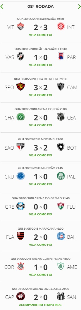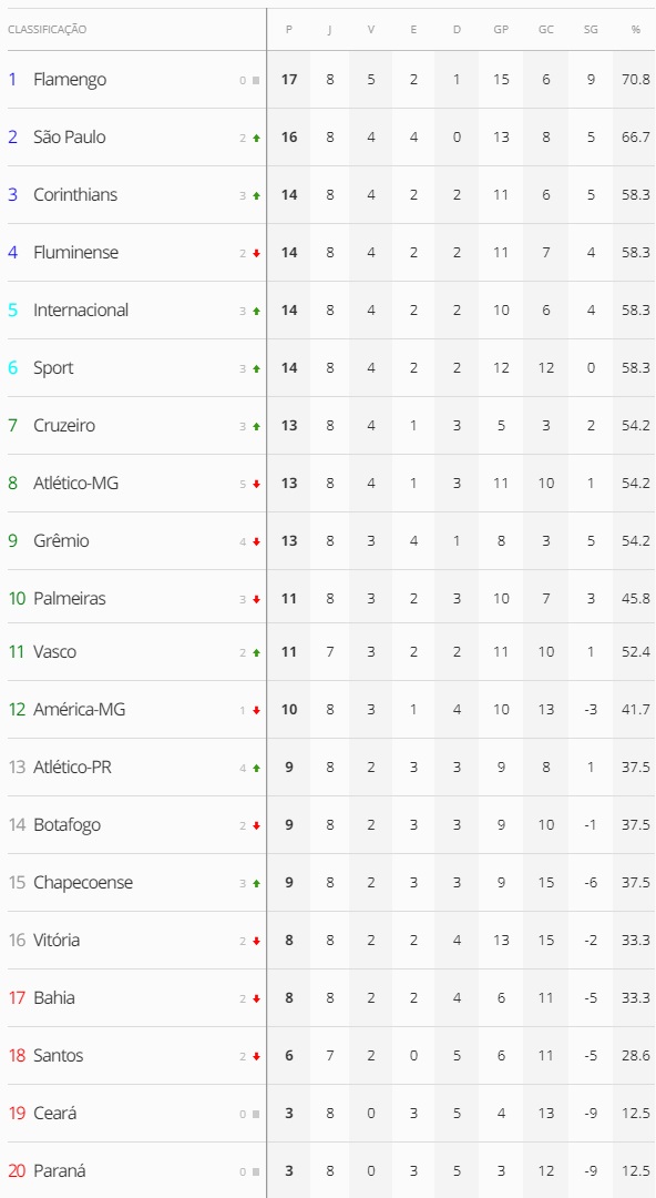 Terminada a 8ª rodada do Campeonato Brasileiro, o Vasco, que venceu o Paraná por 1 a 0, subiu da 13ª para a 11ª colocação na classificação. O Gigante da Colina, no entanto, tem 1 jogo a menos do que a maioria dos participantes, pois seu duelo contra o Santos, fora de casa, válido pela 3ª rodada, só será realizado após a Copa do Mundo.