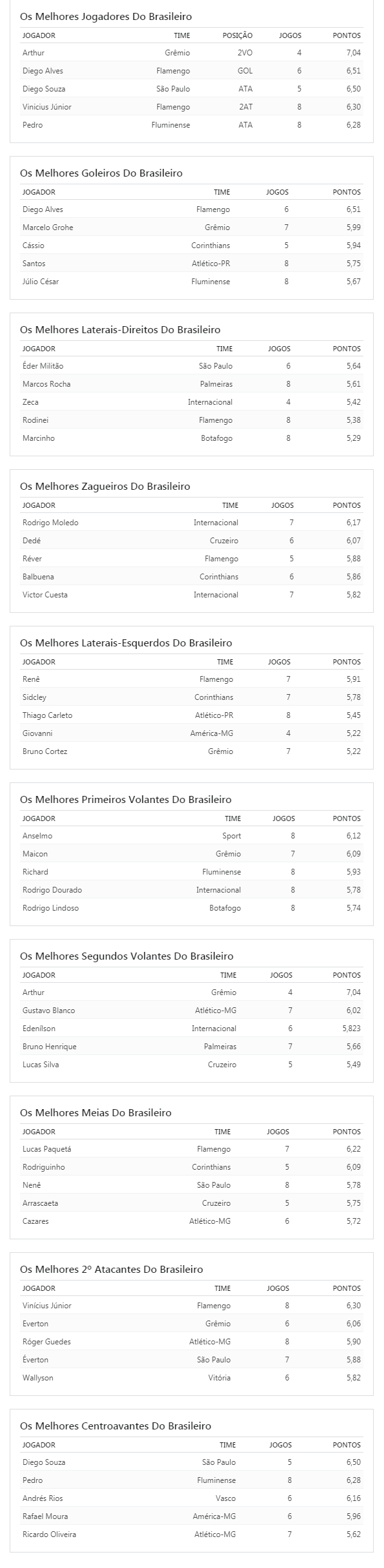 No momento, o segundo colocado é Gustavo Blanco (Atlético-MG), que já foi o melhor segundo volante em duas rodadas diferentes (3ª e 8ª). Lembrando que Arthur está lesionado, não deve voltar a jogar antes da Copa e pode ir para o Barcelona nesta janela.