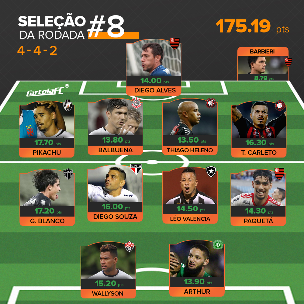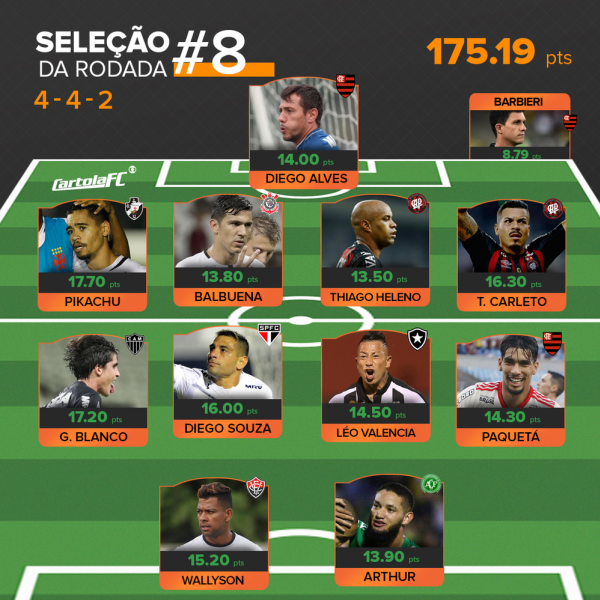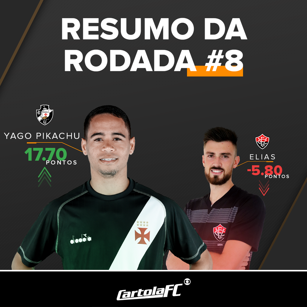 O Clássico dos Milhões foi destaque na seleção da rodada #8. O Flamengo é o mais representado, com o goleiro Diego Alves (14.00) e o meia Lucas Paquetá (14.30), além do técnico Maurício Barbieri (8.79). Porém, o mito vem do rival Vasco da Gama. Yago Pikachu foi o autor do gol único na vitória sobre o Paraná e ainda contou com o bônus de defesa para ficar com 17.70.