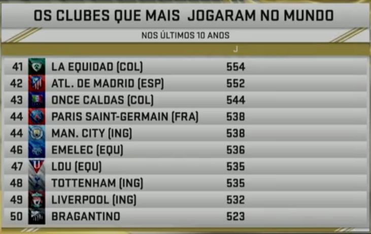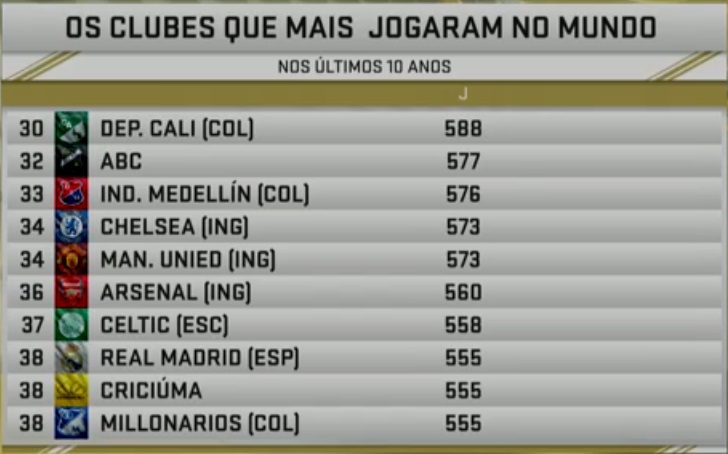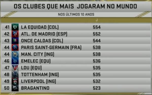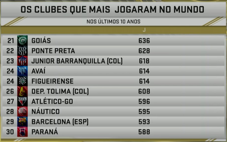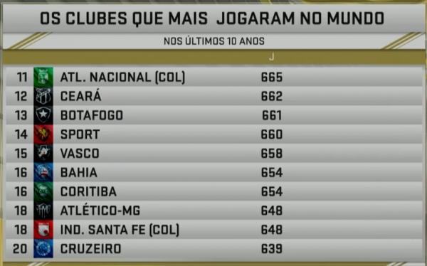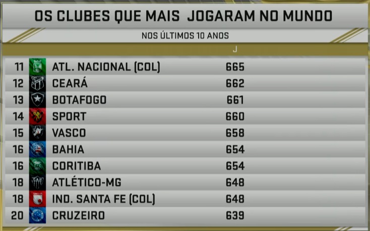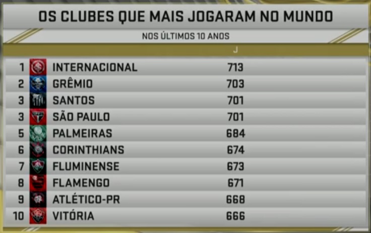 Segundo levantamento da Pluri Consultoria, o Internacional foi o time que mais jogou nos últimos 10 anos no futebol mundial, com 713 partidas. Detalhe: os dez primeiros colocados da lista são brasileiros. O primeiro sul-americano a aparecer é o Atlético Nacional, da Colômbia, em 11º, e a Europa só aparece em 29º, com o espanhol Barcelona.
