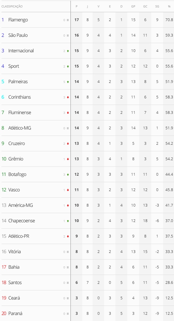 Faltando 6 jogos para o fim da 9ª rodada do Brasileiro, o Vasco está em 12º lugar na classificação.