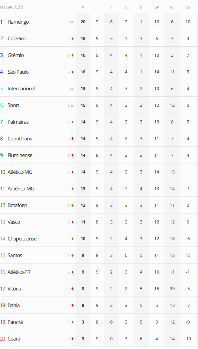 Após os jogos deste domingo, o Vasco, que perdeu para o Botafogo, caiu para a 13ª colocação do Campeonato Brasileiro.
