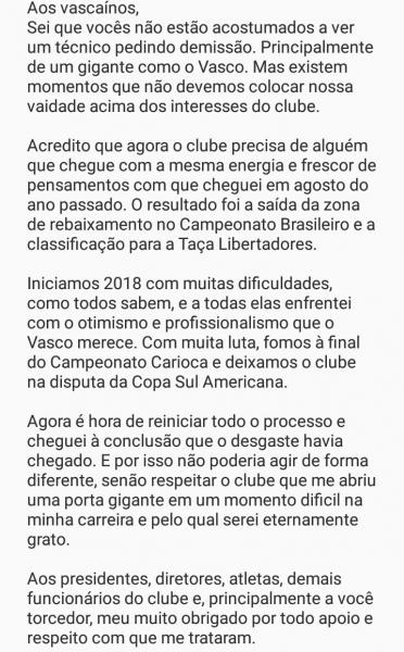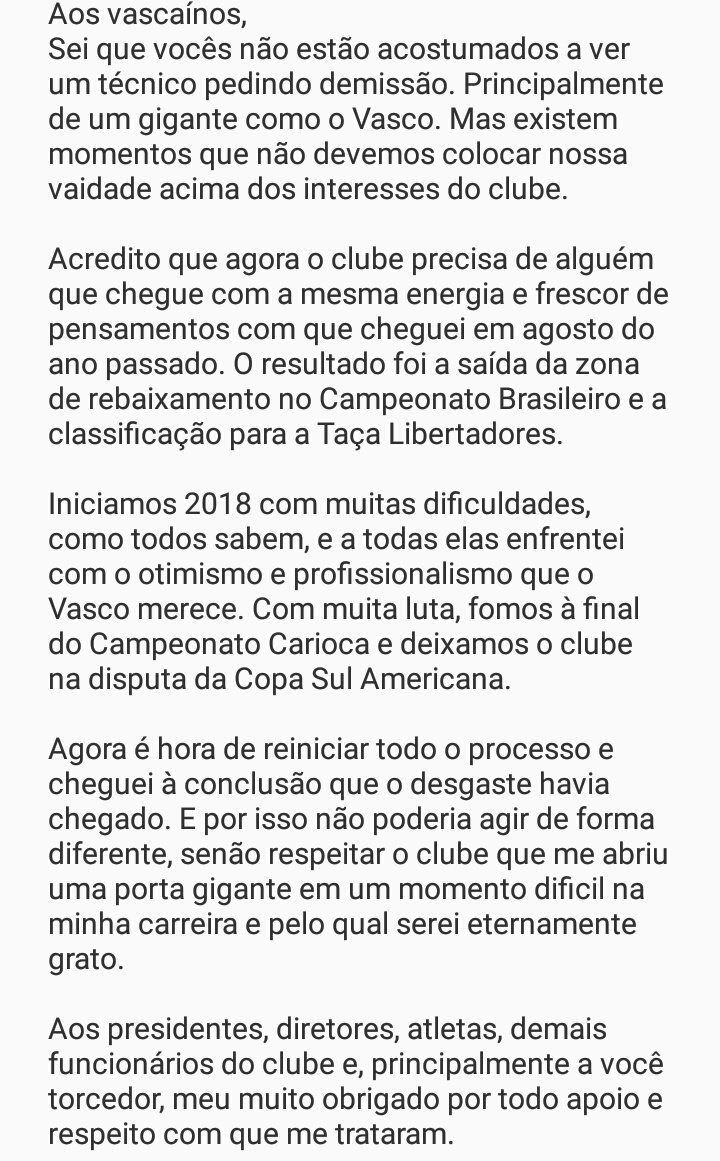 As primeiras palavras de Zé Ricardo depois da saída do Vasco. Em nota, técnico explica decisão e, no fim (não coube na imagem), deseja sucesso ao clube #gevas