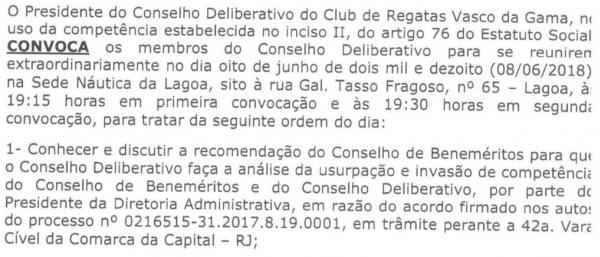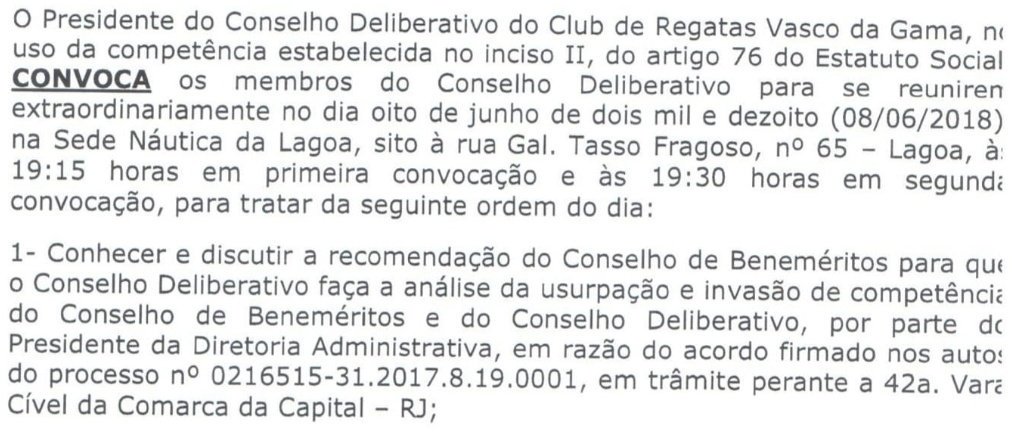 Roberto Monteiro convocou o Deliberativo do Vasco após recomendação do Conselho de Beneméritos, presidido por Eurico Miranda, para analisar possível usurpação de poder e invasão de competência por parte de Campello no que seriam atribuições dos dois Conselhos #lanceVAS
