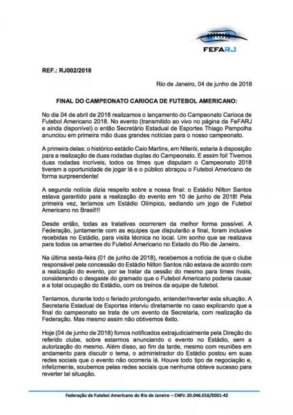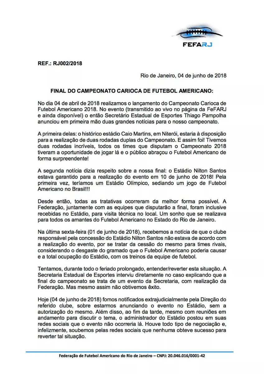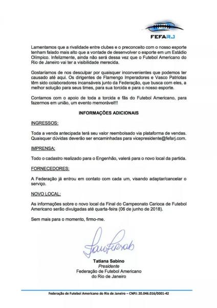 Botafogo vetou a realização da final do Carioca de Futebol Americano entre Vasco x Flamengo no Nilton Santos, domingo. Fefarj, em comunicado, diz que o clube argumentou "se tratar da cessão para times rivais", além do desgaste do gramado e treinos de futebol lá. Espia #lanceVAS