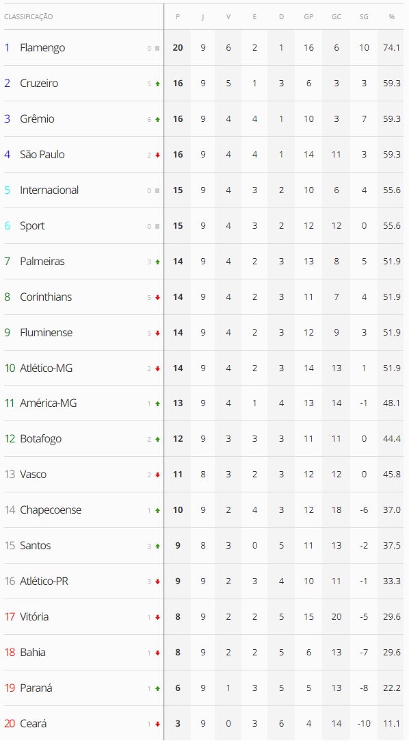 Terminada a 9ª rodada do Campeonato Brasileiro, o Vasco, que perdeu para o Botafogo por 2 a 1, caiu da 11ª para a 13ª colocação na classificação, passando a ficar a 4 pontos do G6 e a 3 do Z4.