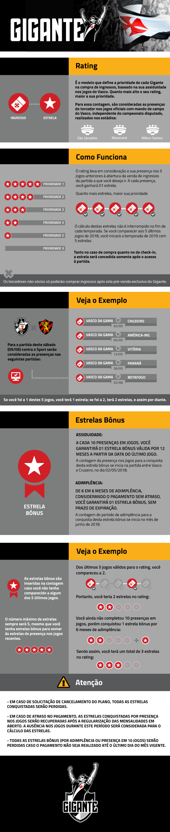 O Rating é o modelo que define a prioridade de cada Sócio-Torcedor Gigante na compra dos ingressos, baseado na sua assiduidade nos jogos em que o Vasco tem o mando de campo. A cada presença, ele ganha uma estrela.
