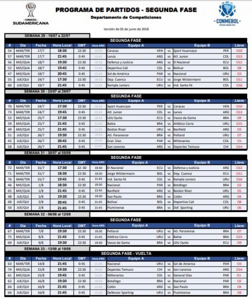 A Conmebol divulgou nesta terça-feira as datas e os horários das partidas da segunda fase da Copa Sul-Americana.