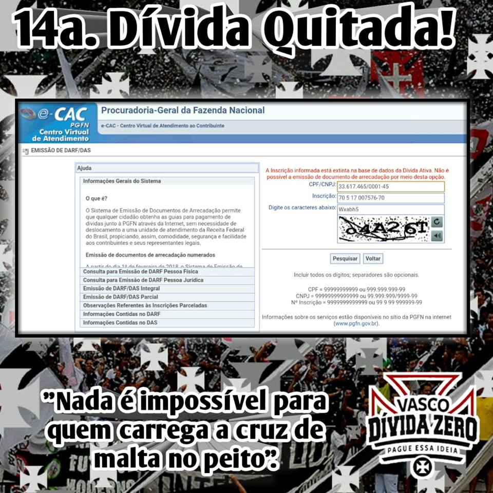 Hoje, 07 de junho, a campanha Vasco Dívida Zero, através de seus contribuintes, quitou mais um débito do Vasco junto ao fisco, inscrição número 70 5 17 007576-70 no valor de R$ 12.842,62. É a 14a Dívida Extinta desde 1o. de maio de 2013.
