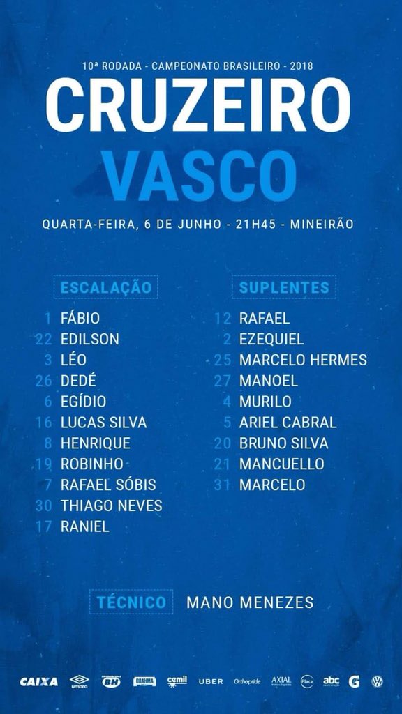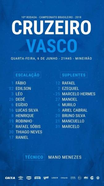 Veja a escalação do Cruzeiro para o jogo contra o Vasco
