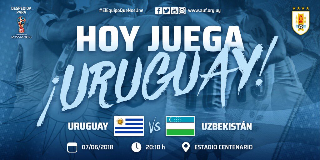 O Uruguai está no Grupo A da Copa do Mundo e estreia na competição no dia 15/06, às 9h, contra o Egito, enfrentando, a seguir, Arábia Saudita, no dia 20/06 às 12h, e Rússia, no dia 25/06 às 11h (horários de Brasília).
