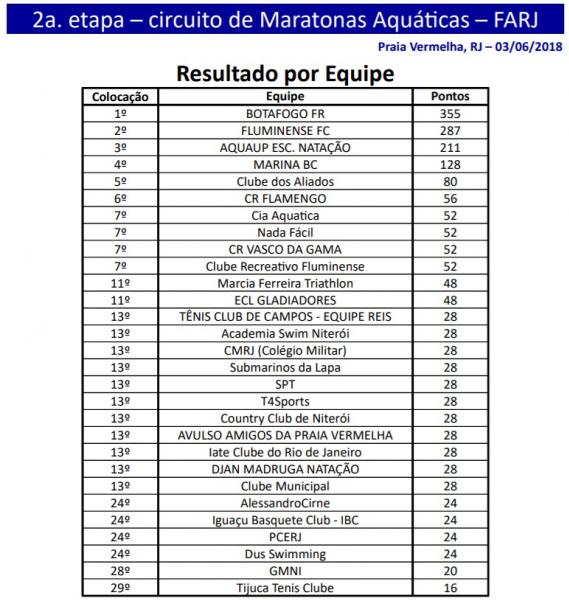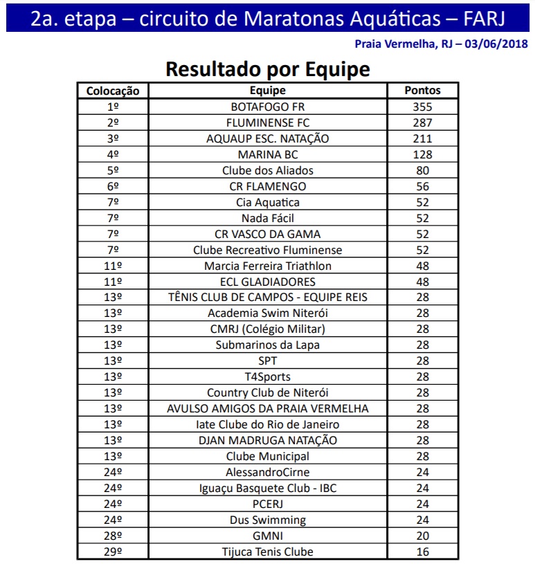 Na 2ª Etapa do Circuito Estadual de Maratonas Aquáticas da Federação Aquática do Rio de Janeiro, disputada na Praia Vermelha (Urca), no último domingo, 3/6/2018, a nadadora Gloria Raizer Ribeiro conquistou o terceiro lugar geral entre as nadadoras Máster, com o primeiro lugar na classe Master D (de 40 a 45 anos).