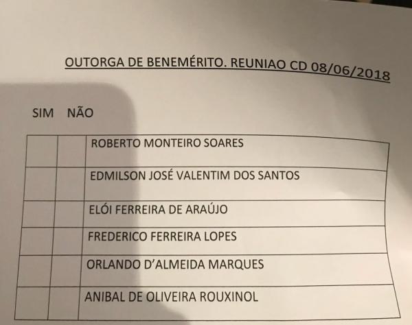 Veja a cédula onde conselheiros votam se aprovam ou não a concessão de títulos de benemérito