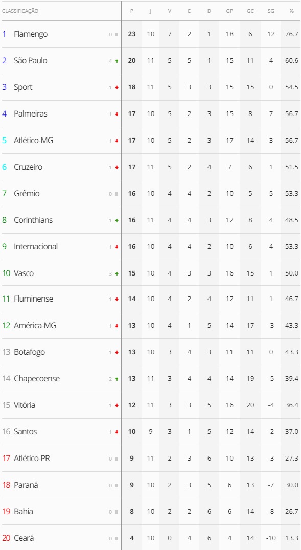 Após os jogos de sábado da 11ª rodada do Brasileiro, o Vasco está na 10ª colocação na tabela. Seis jogos completam a rodada neste domingo. Vasco e Santos têm um jogo a menos do que os demais competidores. O duelo entre eles, válido pela 3ª rodada, só acontecerá depois da Copa do Mundo.