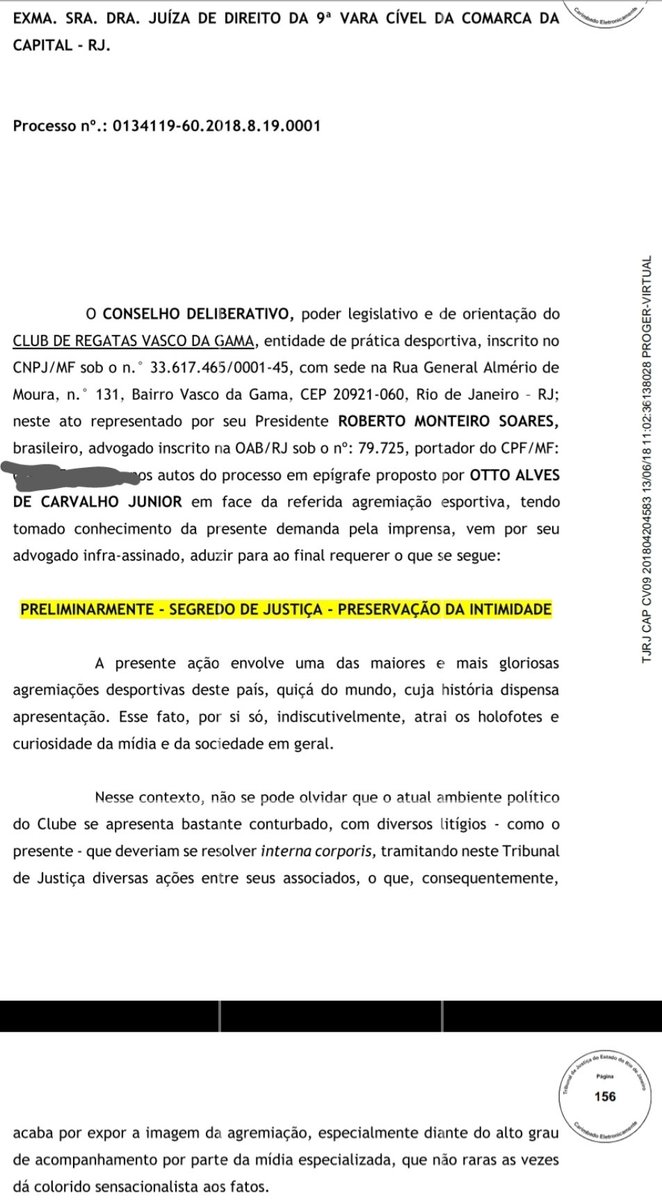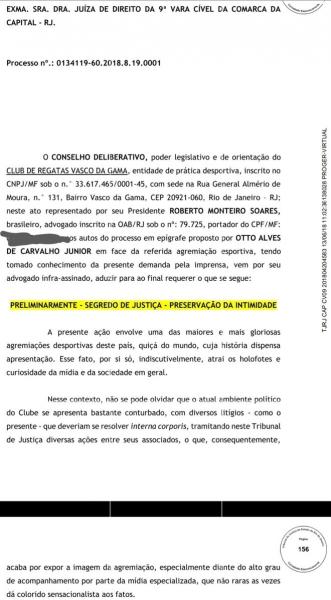 Presidente do Conselho Deliberativo do Vasco, Roberto Monteiro entrou na ação de Otto Carvalho - que visa anular o efeito da reunião que aprovou seis novos beneméritos e a moção de repúdio contra Alexandre Campello - pedindo segredo de justiça para preservar intimidade #lanceVAS