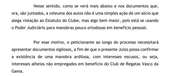 Em trecho do pedido, argumenta que a "celeuma dos autos não é uma simples ação de um sócio (...) mas algo bem maior, pois está se usando o Poder Judiciário para manobras pouco ortodoxas em benefício pessoal" #lanceVAS