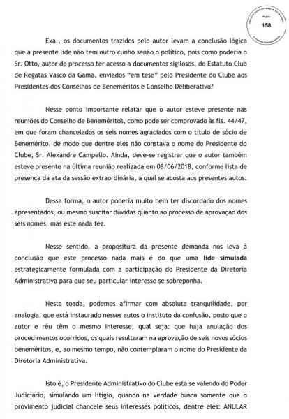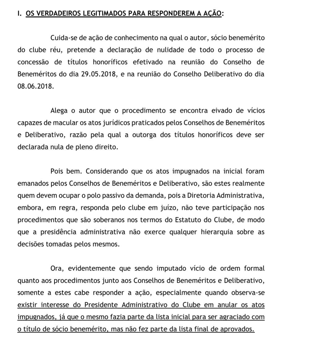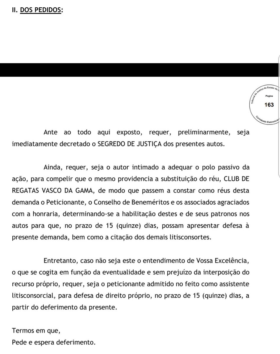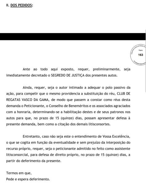 Ainda é solicitado que réu deixe de ser o Vasco, representado por Alexandre Campello, e passe a ser os Conselhos Deliberativo e de Beneméritos, e os seis sócios aprovados. Alega que há interesse do Campello por não ter virado benemérito e que inicial tem cunho político #lanceVAS