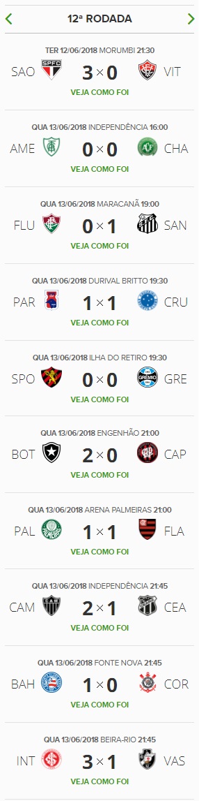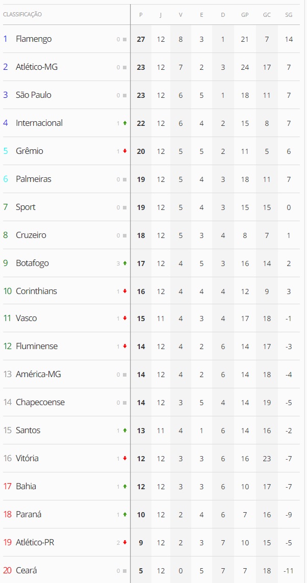 Terminada a 12ª rodada do Campeonato Brasileiro, o Vasco, que perdeu para o Internacional por 3 a 1, caiu da 10ª para a 11ª colocação na classificação, ficando a 4 pontos do G6 e a 3 do Z4.