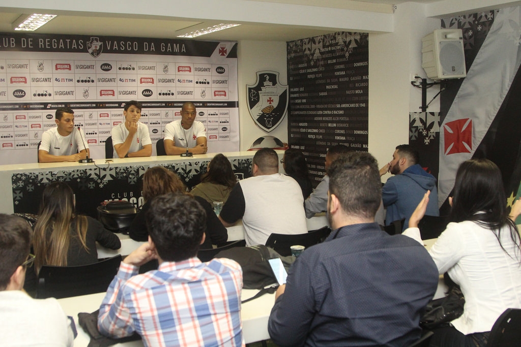 O projeto Media Training, desenvolvido pela Assessoria de Imprensa do Vasco da Gama, ofereceu aos atletas da base cruzmaltina uma experiência inesquecível. Na tarde desta quinta-feira (14/06), a sala de imprensa de São Januário recebeu mais uma entrevista coletiva, mas desta vez com estudantes de jornalismo. Nos moldes realizados diariamente pelo futebol profissional, o goleiro Lucão, o volante Bruno e o meia Roger, integrantes da categoria sub-17, conversaram com os alunos da Universidade Veiga de Almeida, localizada no Rio de Janeiro.