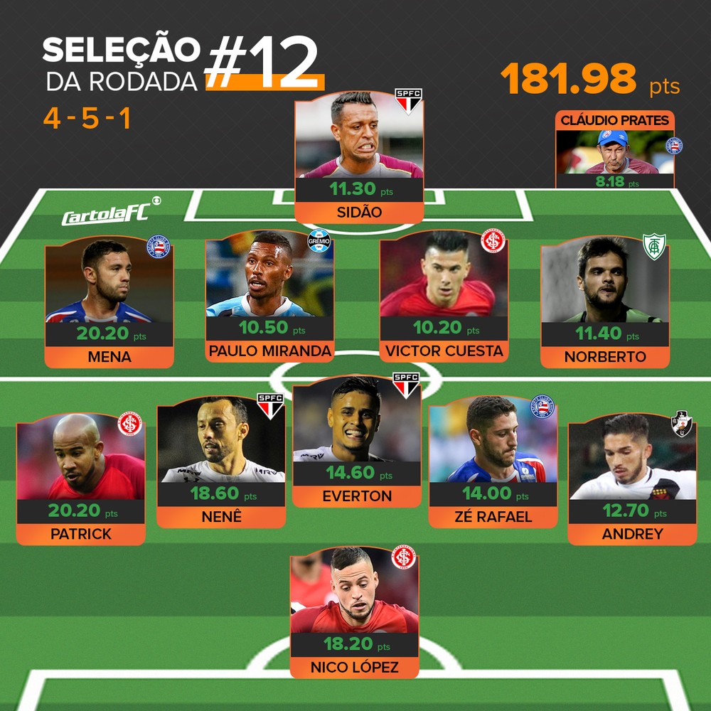 O Internacional e o São Paulo foram os grandes destaques com três jogadores, cada um, na seleção da rodada #12. Do Colorado, o mito Patrick (20.20), Nico López (18.20) e Víctor Cuesta (10.20). Do Tricolor, Sidão (11.30), Nenê (18.60) e Everton (14.60). O Bahia também foi bem, com dois jogadores - Mena, um dos mitos, com 20.20, e Zé Rafael, com 14.00 - e o técnico Cláudio Prates, com 8.18.