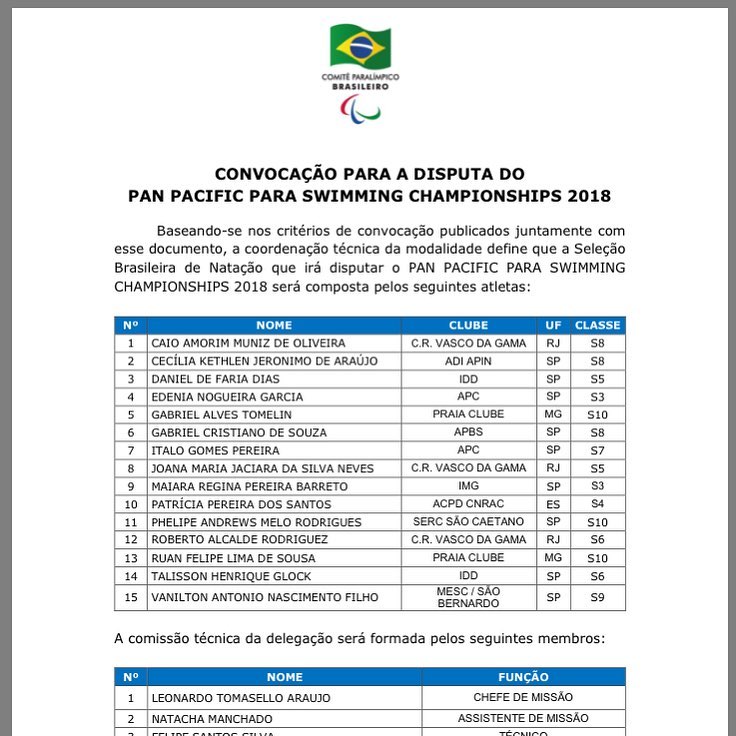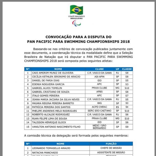 A seleção brasileira de natação realizou a convocação para a disputa do Pan Pacific para Swimming Championships 2018. E o Vasco da Gama foi o clube com mais atletas presentes na convocação.