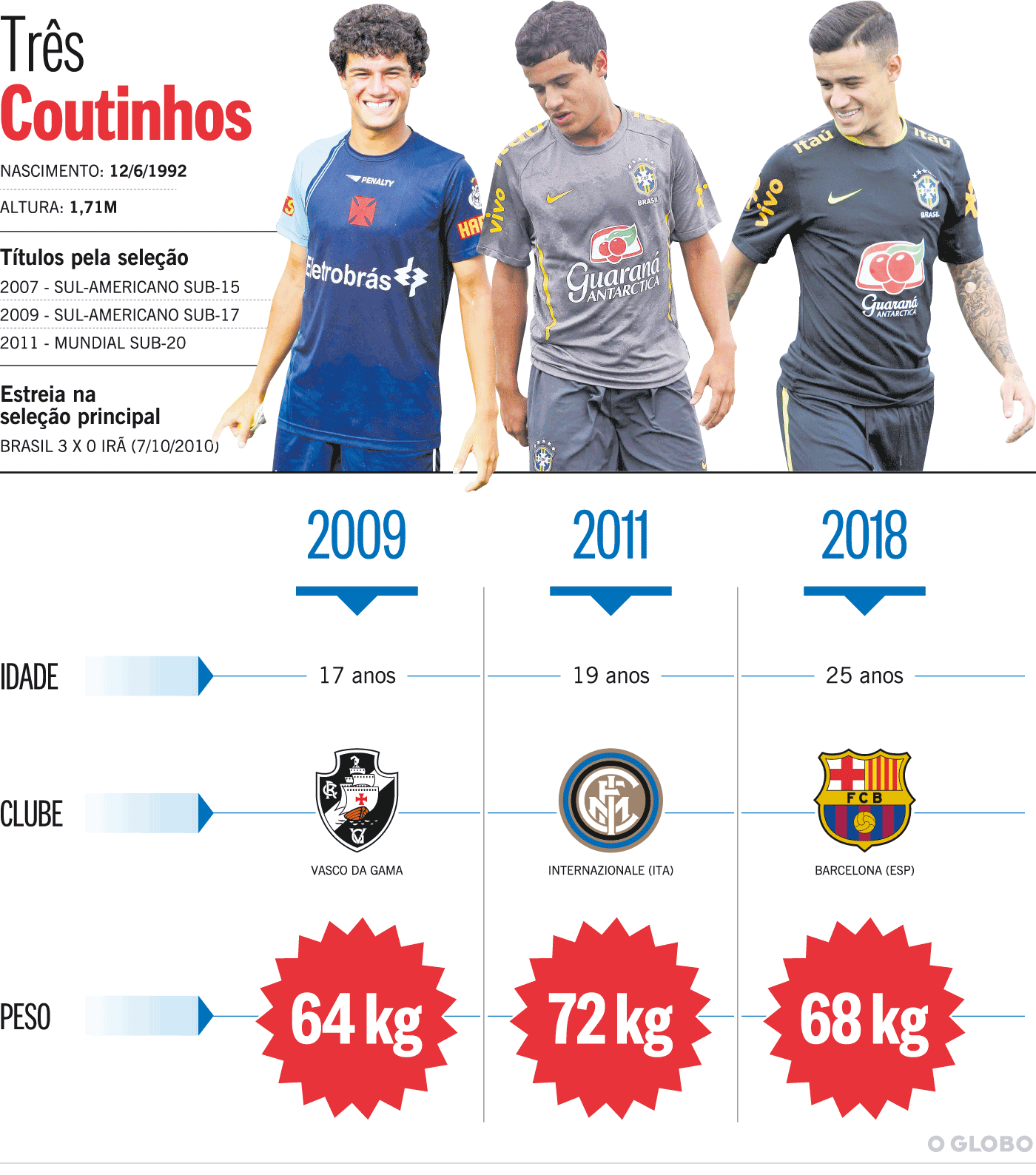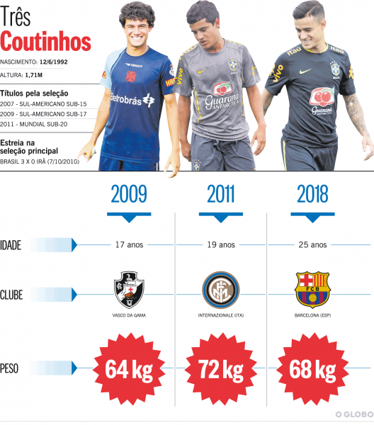 Foram 4kg perdidos desde 2011, com ganho de massa magra. Coutinho está mais seco do que nunca, o que deixa a seleção brasileira confiante de que poderá suprir a carência de Neymar, ainda em processo de recuperação da fratura no pé direito. No amistoso contra a Croácia, dia 3, ele deverá ser titular na função do camisa 10. Para o preparador físico da seleção, chegou a sua hora